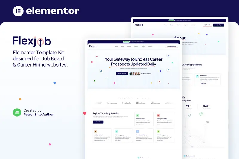 Flexjob – Job Board & Vacancies Elementor Template Kit là bộ Template Kit được thiết kế hiện đại và tinh tế, hoàn hảo cho những ai muốn xây dựng website chuyên nghiệp về nhân sự, tuyển dụng, dịch vụ HR, hoặc trang listing việc làm. Với giao diện đẹp mắt, độc đáo, bố cục 100% responsive và chuẩn Retina, bộ Kit này rất dễ dàng tùy chỉnh nhờ sử dụng Elementor, giúp bạn thiết kế trang web mà không cần một dòng code nào.