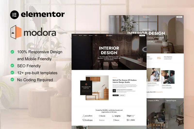 Modora là bộ Elementor Pro Template Kit hoàn hảo dành cho website thiết kế nội thất, kiến trúc, bất động sản và nội thất. Với hơn 12 template có sẵn, thiết kế đơn giản, hiện đại, bạn dễ dàng xây dựng website chuyên nghiệp để giới thiệu dự án thiết kế nội thất một cách ấn tượng.