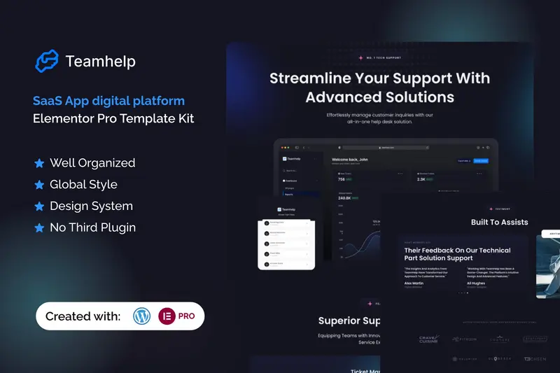 Teamhelp – Help Desk SaaS Elementor Pro Template Kit: Giải pháp hoàn hảo cho Trung tâm Hỗ trợ và IT Software